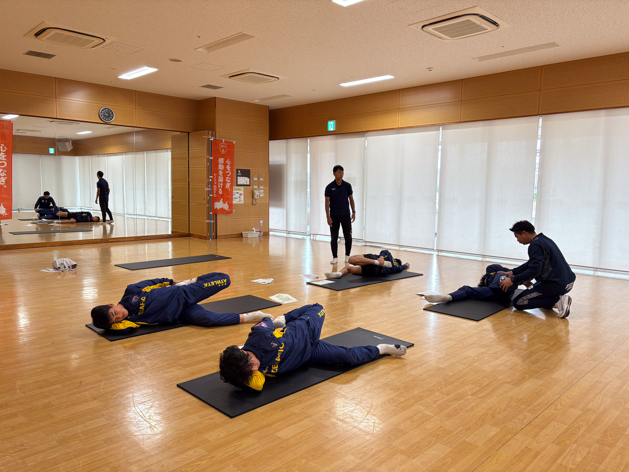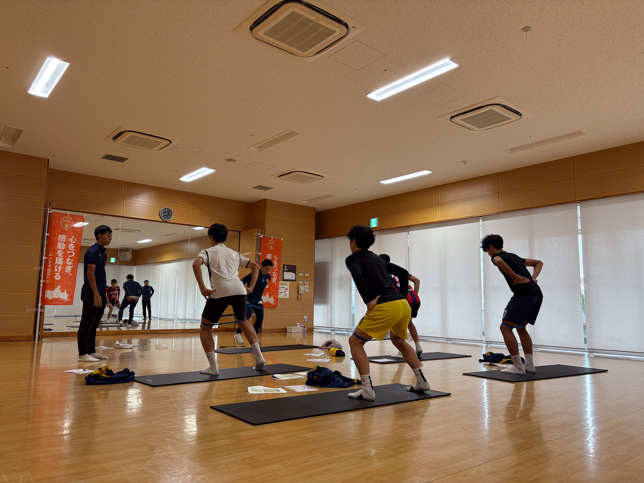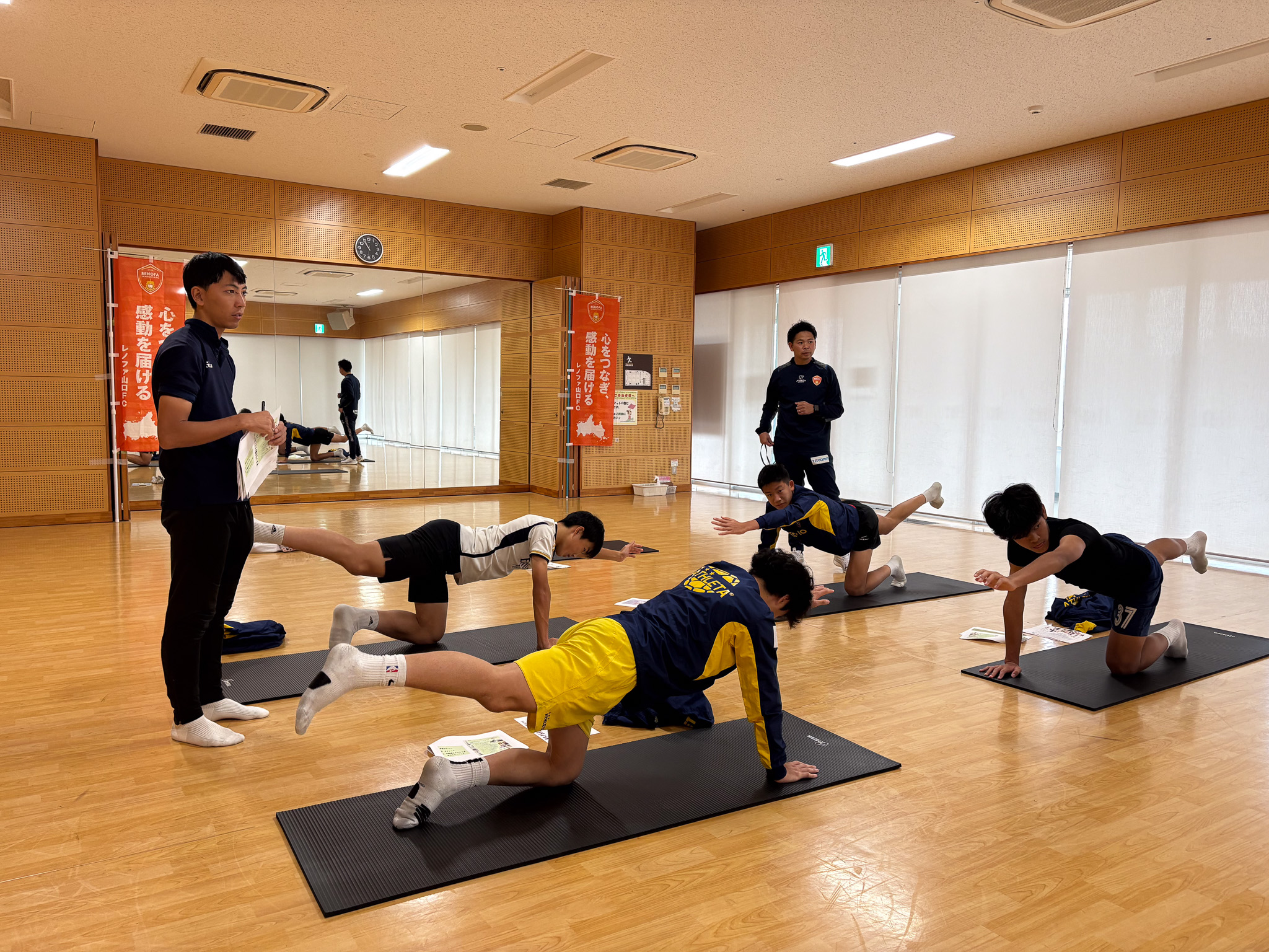 レノファ山口FCアカデミーの平本コーチより、けがを防ぐ正しいストレッチやウォーミングアップ、体幹トレーニングの重要性を講義実習しました。