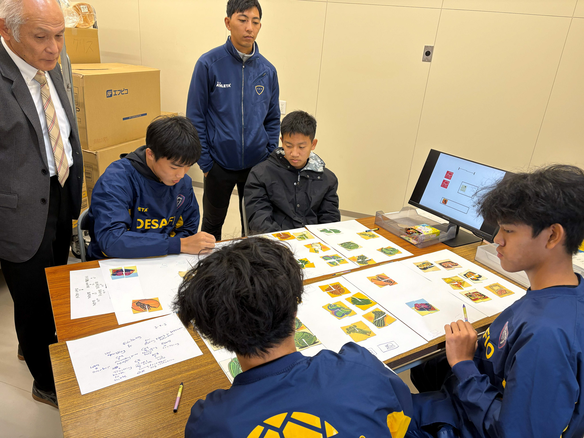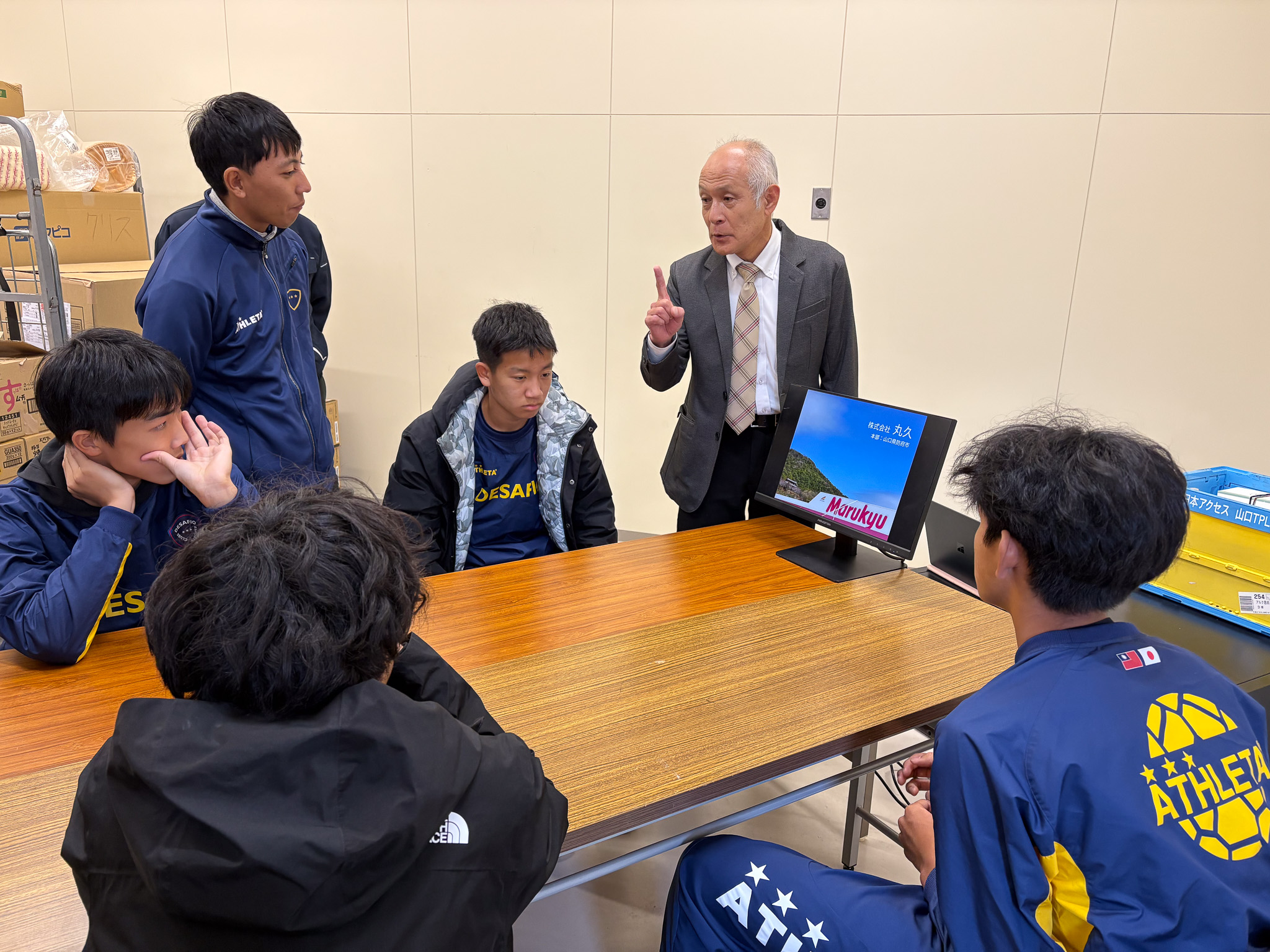 アルク防府店では、株式会社丸久 人事能力開発部の黒川指導役のもと子どもたちに「サッカーとビジネスで必要な力」をテーマに、丸久が大切にしている考え方や他者との関わり合いのコツなどをサッカーの話も交えながら熱く楽しくゲーム形式で学ぶことができました。(なんと黒川指導役はレノファ山口FCの前身の山口県サッカー教員団OBというご縁も!)