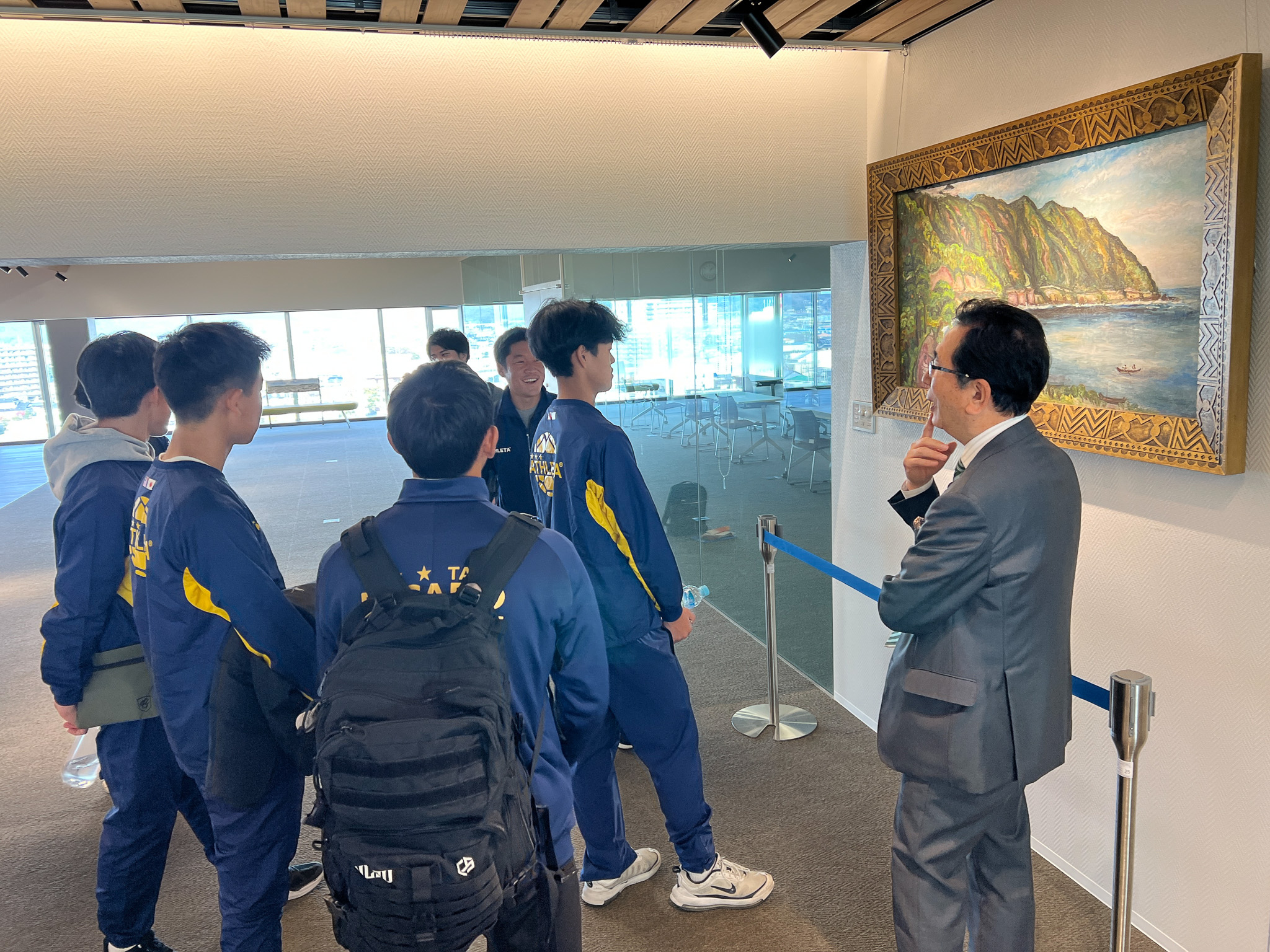 防府市役所庁舎8階展望回廊では防府市・台湾との歴史・文化のつながりとして、日台友好促進山口県議会議員連盟 島田教明会長様より、防府市出身第11代台湾総督・上山満之進(かみやまみつのしん)が台湾の画家・陳澄波(チェンチェンポー)に依頼した油絵「東台湾臨海道路」について説明を受けました。その後、防府天満宮では台湾・嘉義県にて製作され奉納された「台湾産檜賽銭箱」や神社参拝における礼儀作法などを体験しました。