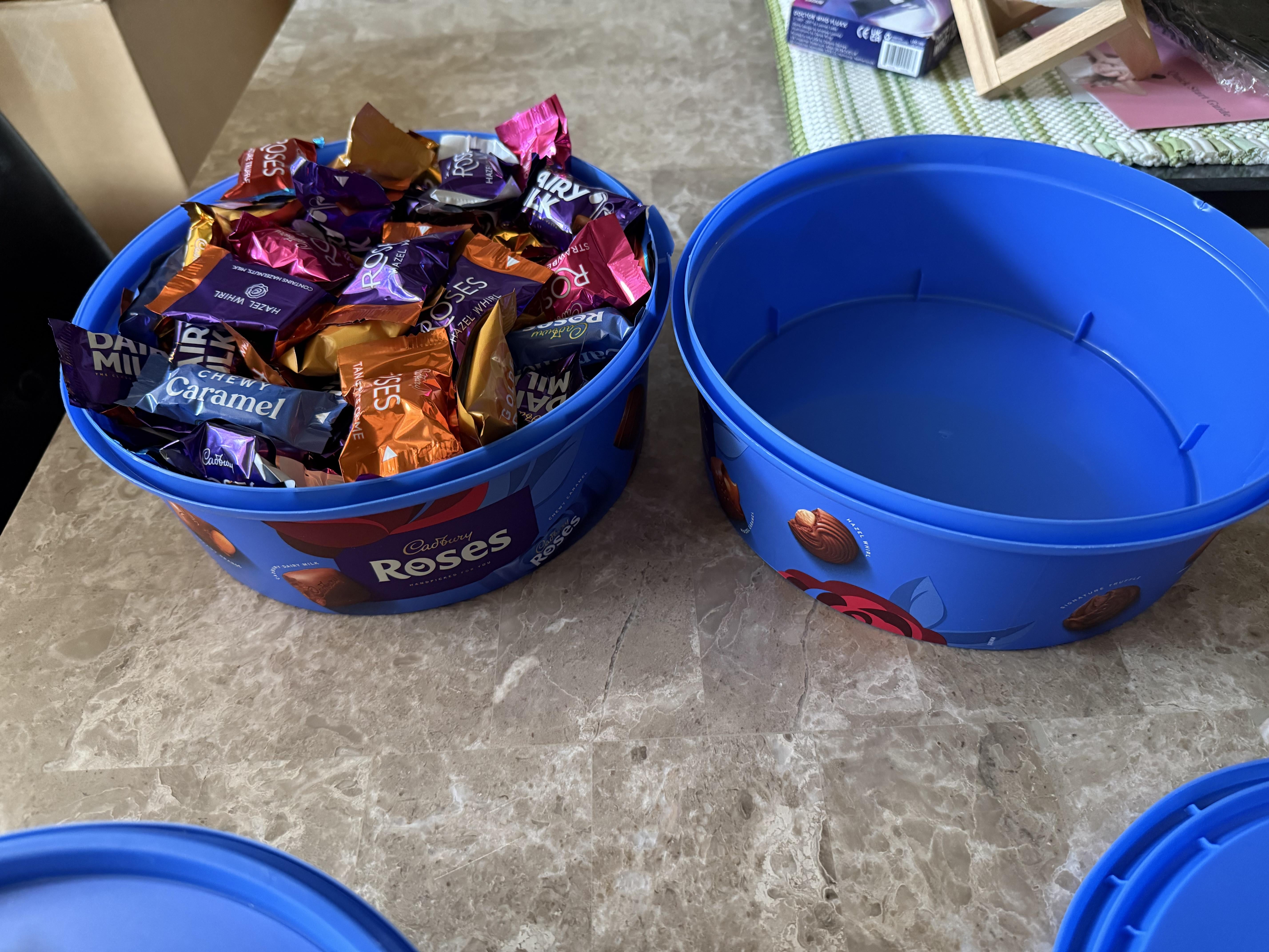 キャドバリー ローズの浴槽 2 つが 1 つに収まり、蓋は完全に閉まりました。