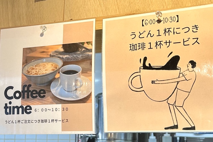 そして午前10:30までは、うどん一杯につき珈琲を一杯無料サービス!