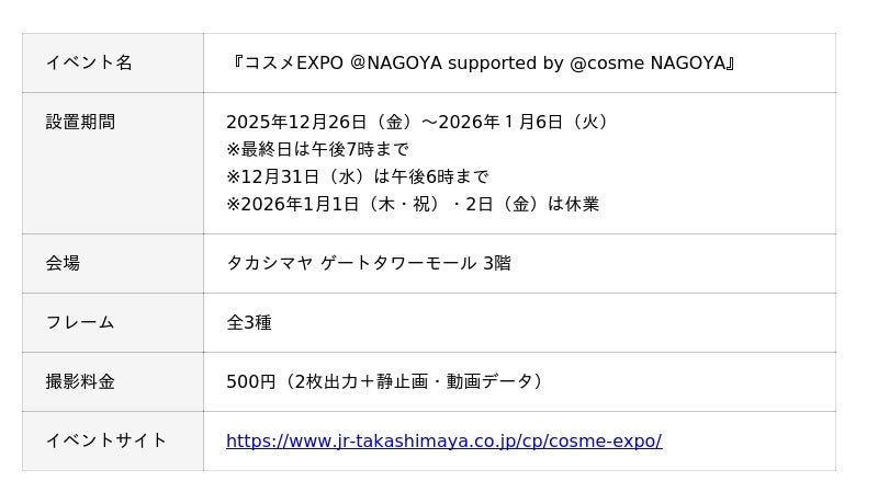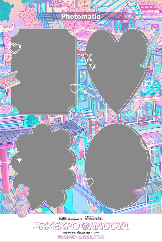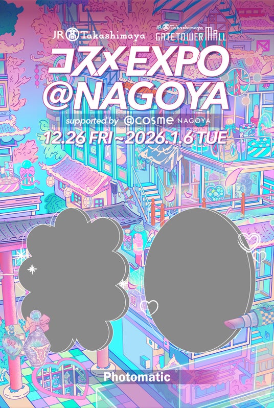 キタムラ・ホールディングス グループのピックハイブ株式会社(本社:東京都新宿区、代表取締役社長 兼 COO:大迫 由典)が運営するセルフフォトブランド「Photomatic(読み:フォトマティック)」は、2025年12月26日(金)~2026年1月6日(火)の10日間〔2026年1月1日(木・祝)・2日(金)は休業〕”名古屋駅を美の聖地に”を合言葉に、「ジェイアール名古屋タカシマヤ」と「タカシマヤ ゲートタワーモール」で開催される日本最大級のコスメの祭典『コスメEXPO @NAGOYA supported by @cosme NAGOYA』(以下:コスメEXPO)にイベント限定のコラボレーションフレームで撮影できるフォトブースを設置しました。