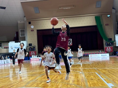 バスケスクールに通うおよそ80名のスクール生がジュニアクラス(小学1~3年生)、ステップクラス(小学4~6年生)の各クラス、3チームに分かれて試合を実施。いつもとは違う、他校のスクール生と交流し、一緒に試合を盛り上げてくれました。試合後には、フリースロー大会を行い、各クラス上位3名が景品を受け取りました。