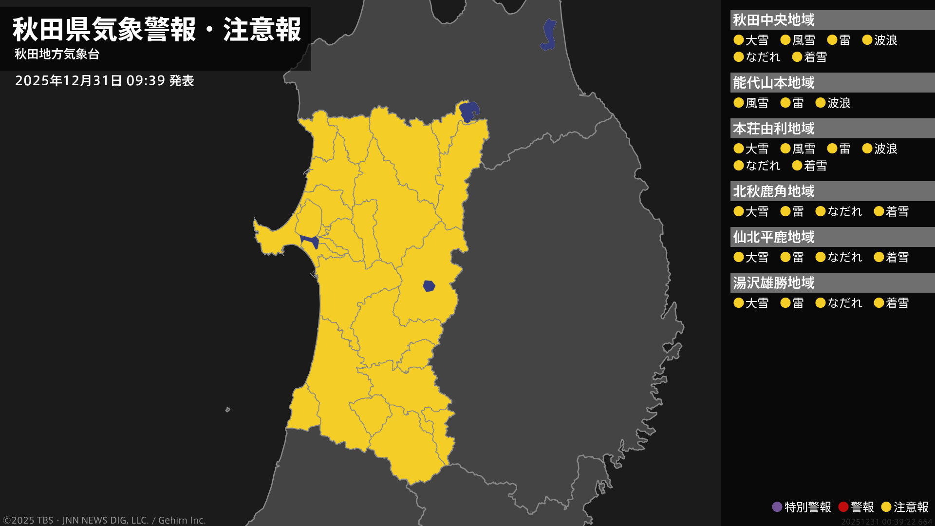 【なだれ注意報】秋田県・秋田市、横手市、大館市、男鹿市、湯沢市、鹿角市などに発表(雪崩注意報) 31日09:39時点