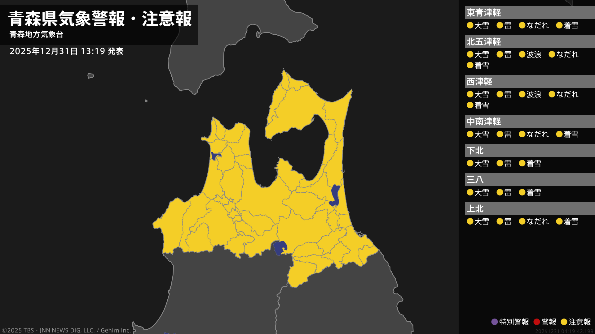 【なだれ注意報】青森県・五所川原市、中泊町に発表(雪崩注意報) 31日13:19時点