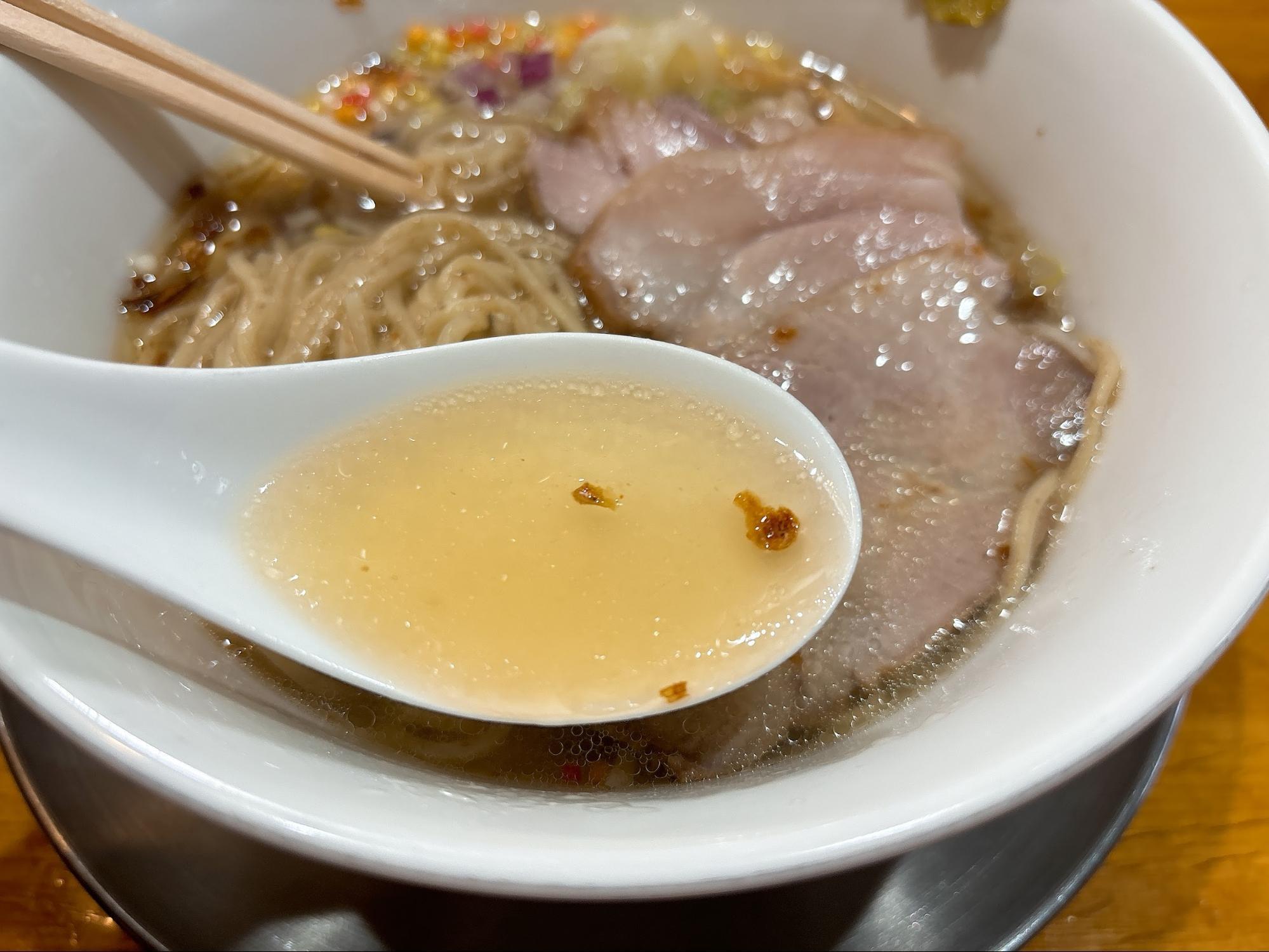 運ばれてきたしおラーメンは、まず見た目がとても美しいです。