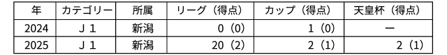 J1リーグ通算:20試合出場2得点、カップ戦通算:3試合出場1得点、天皇杯通算:2試合出場1得点