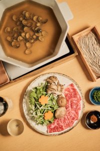 宍道湖のしじみとしまね和牛を存分に味わえる台の物「界 玉造流 しじみ牛しゃぶ」。ぷっくりとした肉厚のしじみの風味と食感は格別で、締めのお食事には、神事でもいただくひきぐるみの生蕎麦をお出汁で茹でた釜揚げでいただくのがおすすめ。