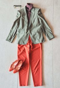 「今シーズン気になるバーガンディ色のニットと同色系のパンツとシューズを合わせました。トレンドカラーのカーキのジャケットをさらりと羽織って、旬のレイヤードを愉しみます」