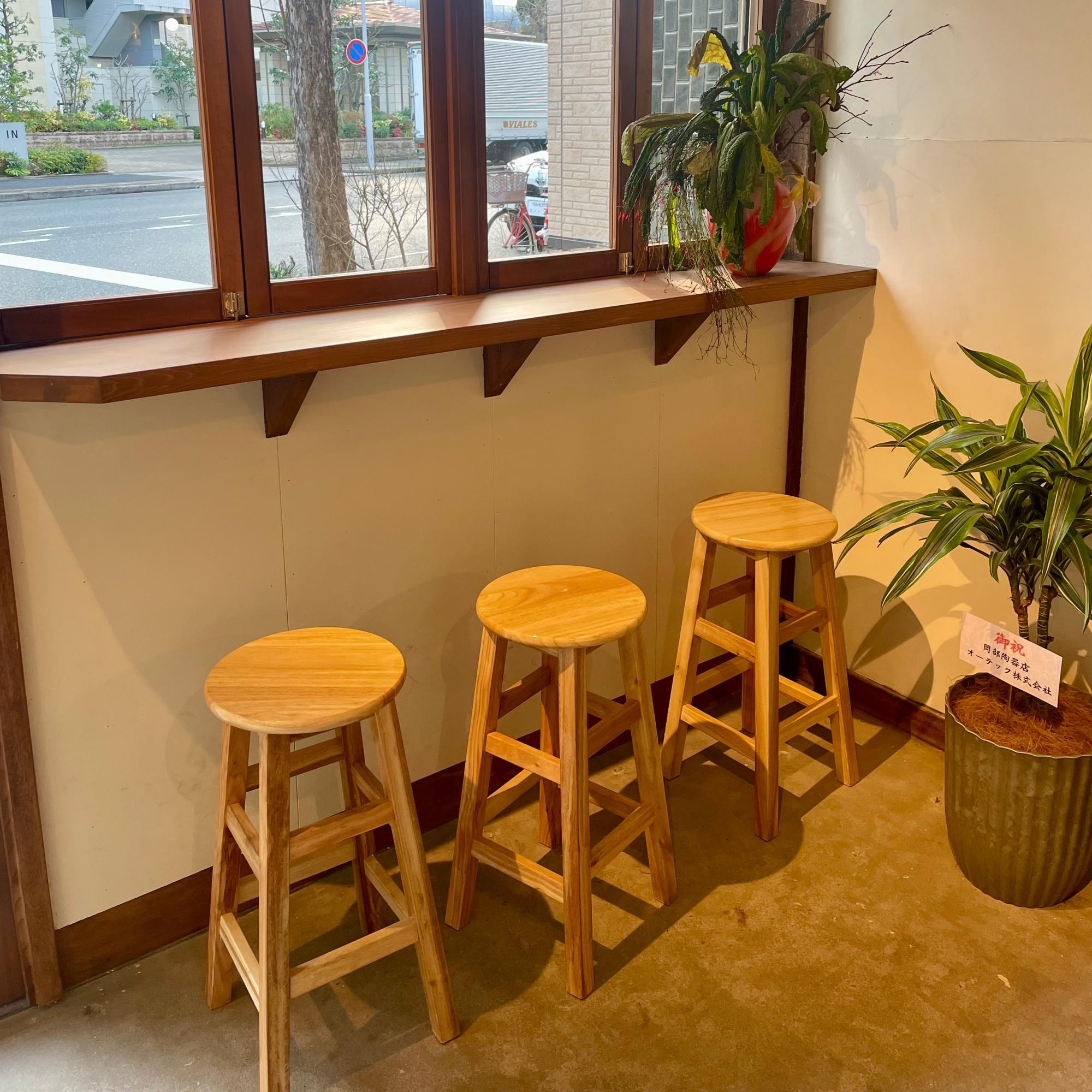 こちらが窓際にあるイートインスペース、小さなカウンターとスツールが設けられています。