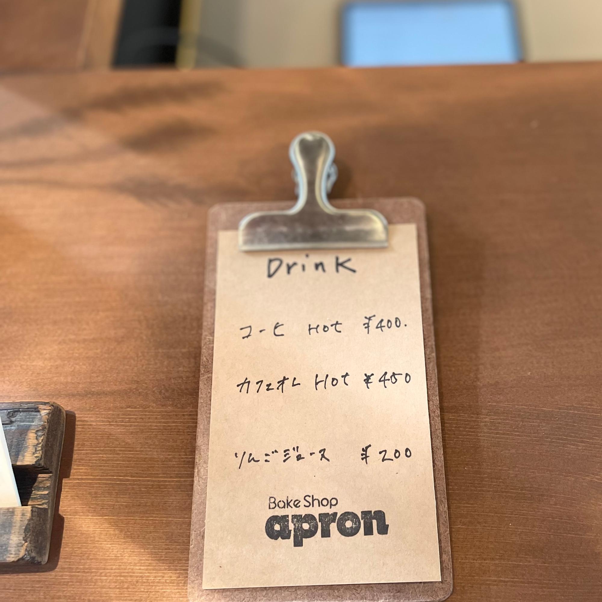 ドリンクメニューは、「コーヒー」、「カフェオーレ」、「リンゴジュース」の3種類。