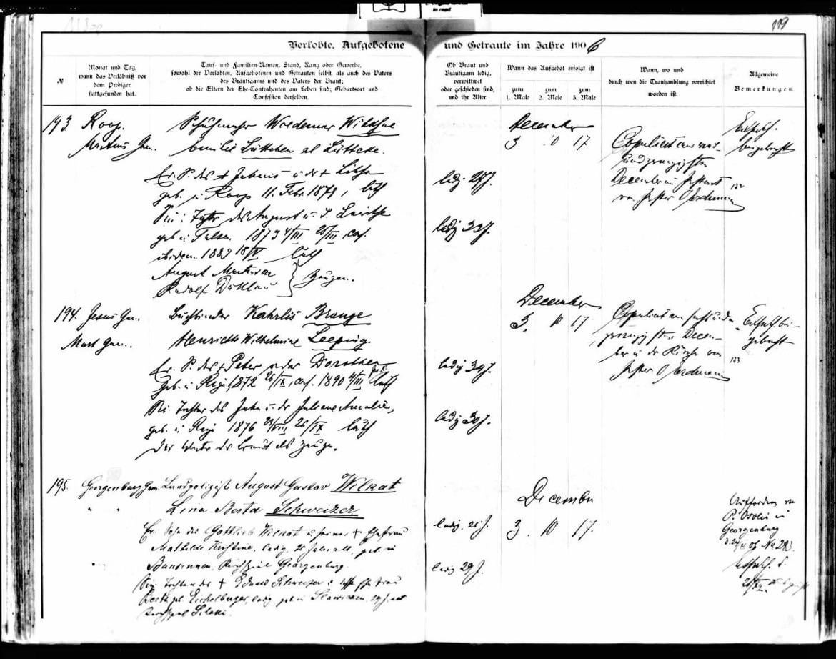 Twitter Pinterest Facebook Tumblr LinkedIn Bluesky Reddit Threads こんにちは、私は家系図の調査をしていて、ラトビアの聖マルティン教会から曽祖父母の結婚記録を見つけました。彼らは当時ロシアの統治下にあったリトアニアに住んでいました。翻訳してもらいたいのですが、ラトビア語かどうかさえわかりません。それはアウグスト・グスタフ・ウィルカットとレナ・ベルタ・シュヴァイツァー(#195)でした。ご協力ありがとうございます。 Latvia