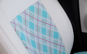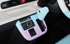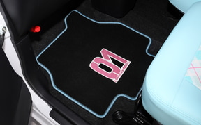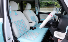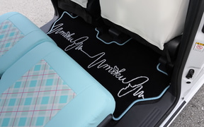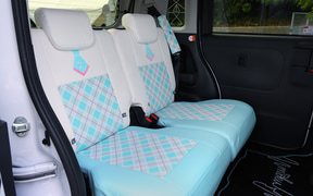 内装はハンドルカバー、シフトレバーカバー、シートベルトパッド、前後シートカバー、そして10インチナビに対応したインテリアパネルセットの5点。パステルカラーの優しいグラデーションやチェック柄を基調としたインテリアは、随所に刺繍があしらわれていて質感も高い。