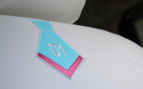ハンドルカバー、シートカバー、シートベルトパッドに配された刺繍は立体的な凝ったものだ