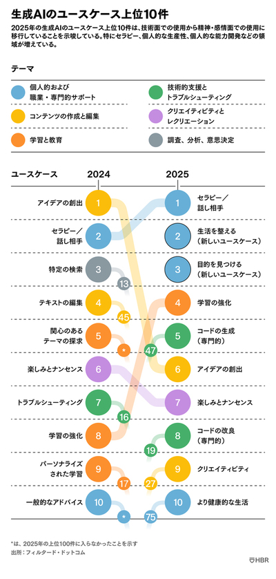 この1年間で、生成AIをめぐる熱狂は大いに高まった。ユーザーの関心は倍増し、AIへの投資は急増しており、政府はより明確で力強い立場を取り、そのリスクは──一部の人によれば人類の未来がかかっているというほど──最高潮に達している。しかし、人々は実際にどのように生成AIを活用しているのだろうか。データが示す上位のユースケースは、セラピーと話し相手(カンパニオンシップ)、生活の整理、そして目的の発見であった。