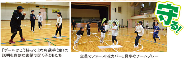 この日は、日本代表の六角彩子選手と數田彩乃選手、2人が所属するチーム「5STARs」主将の小暮涼選手が参加。海南市の株式会社サンコーが、練習用のベースを六角選手と共同開発したことをきっかけに同選手とチームを支援。選手を招き、和歌山初の体験教室が実現した。