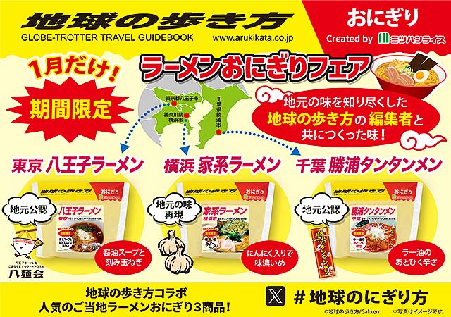 ミツハシは、「ラーメンおにぎりフェア」を開催し、人気旅行ガイドブック『地球の歩き方』と共同開発し、ご当地ラーメンの味わいを再現したおにぎり3品「横浜家系ラーメンおにぎり」「千葉勝浦タンタンメンおにぎり」「八王子ラーメンおにぎり」を 1月2日〜1月31日 の期間限定で、関東を中心としたスーパーマーケットで販売。