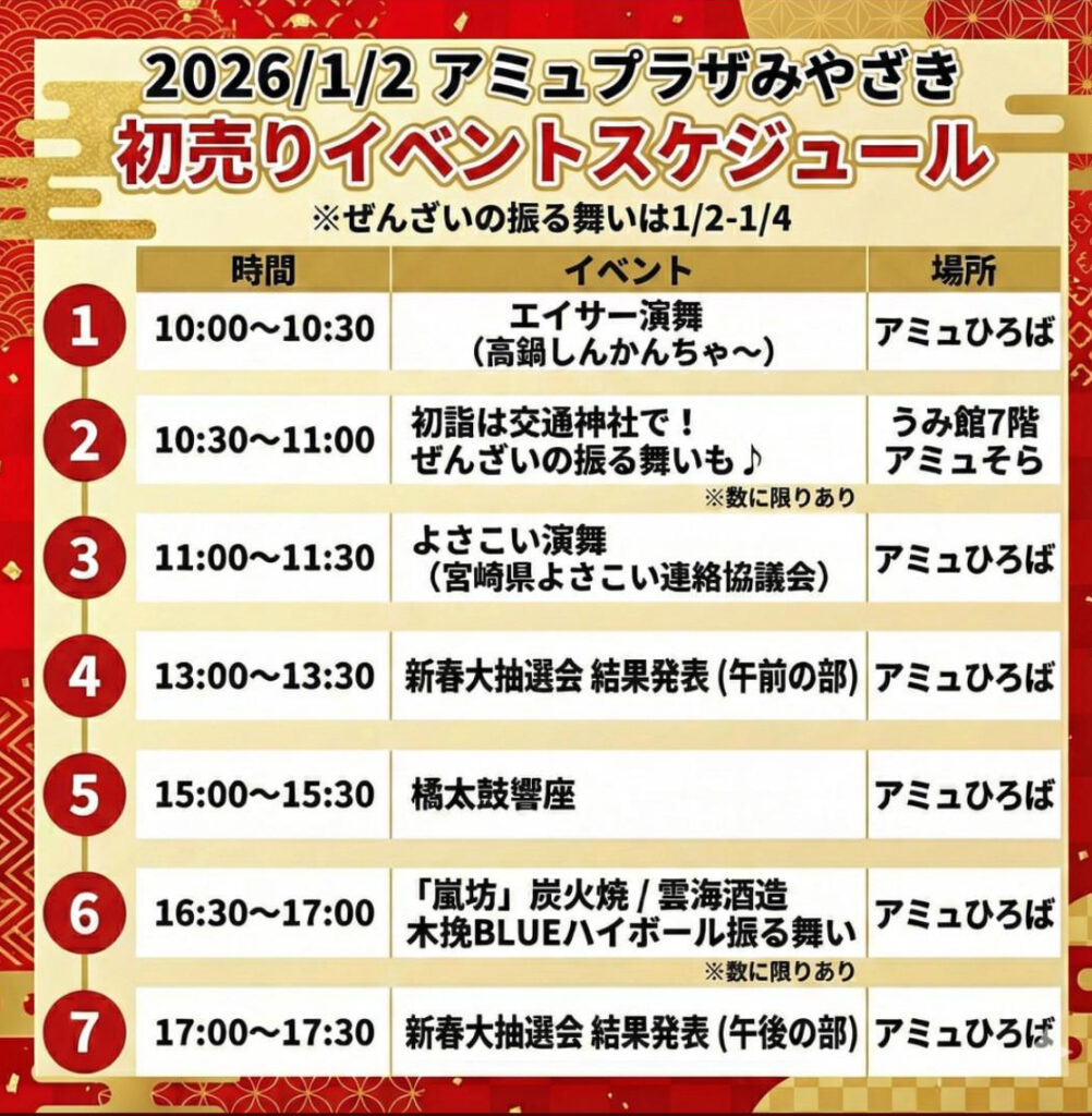 新年のスタートにふさわしい内容が、非常に丁寧に構成された初売りイベントだと感じました。買い物だけでなく、地域の文化や食を一緒に楽しめる点が、アミュプラザみやざきらしい魅力だと思います。