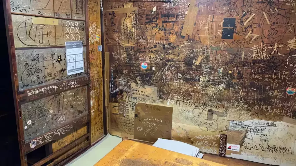 その対面は大正時代から続く居酒屋「静(しずか)」。古民家のような壁や柱は隅々まで落書きで埋め尽くされている。京都の学生たちの長年にわたる仕業だ。