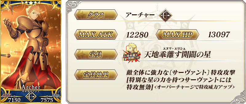 ※上記の「★5(SSR)ギルガメッシュ(アーチャー)」のイラストとセイントグラフは霊基再臨第2段階のものです。