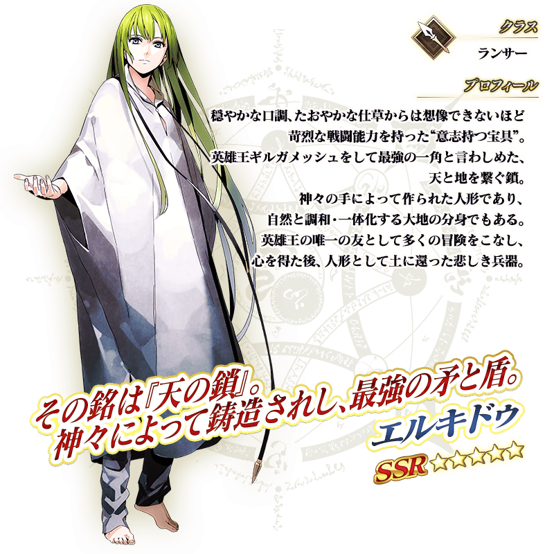 ※上記の「★5(SSR)エルキドゥ」のイラストとセイントグラフは霊基再臨第2段階のものです。