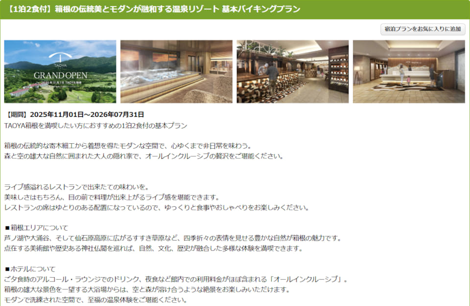 大江戸温泉物語グループの「TAOYA箱根」(神奈川県足柄下郡箱根町仙石原1246)では、1泊2食付き基本バイキングプランを販売中。価格は1人あたり2万3700円~(スタンダードツイン内風呂なしタイプを1室2名利用の場合)。