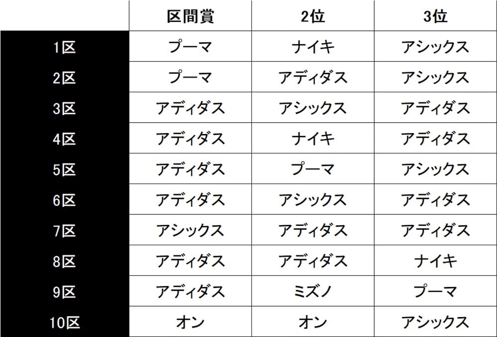そして区間順位上位での着用シューズブランドは下記の通りとなりました。