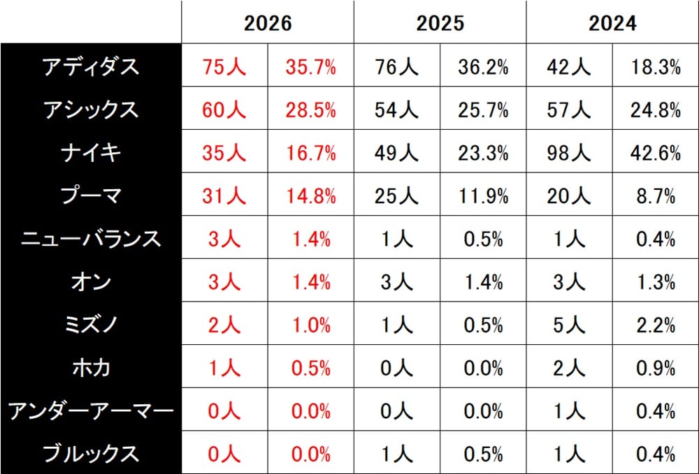 昨年(2025年)も箱根駅伝をその足元、シューズブランド(ナイキ、アディダス、アシックス、ミズノ、ニューバランスなど)のシェアについて分析しましたが、本年も先ず速報ベースで、その結果を大公開。