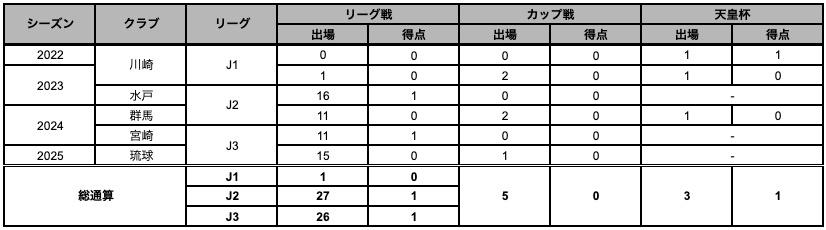 【サッカー歴】ACアスロン→リガール JPC→興国⾼→川崎フロンターレ→⽔⼾ホーリーホック→ザスパ群⾺→テゲバジャーロ宮崎→FC琉球