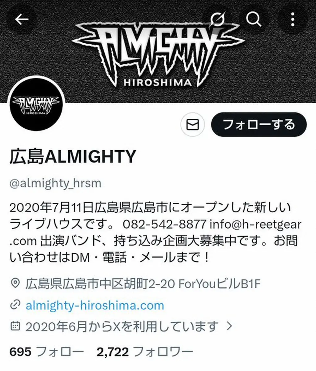 広島県のライブハウス「広島ALMIGHTY」の公式Xが3日に更新。開催予定のライブが延期になったことを報告した。