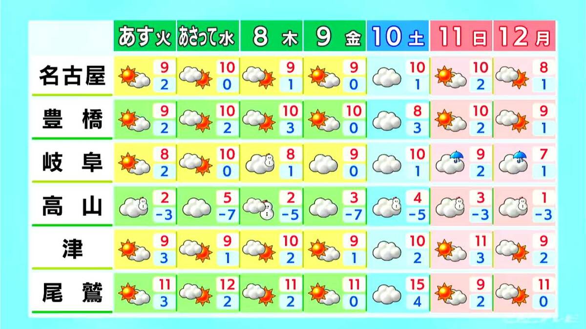 最高気温は名古屋や豊橋、津で12℃、岐阜で11℃の予想です。平年よりも暖かく、きのうよりも2℃ほど高くなる所が多いでしょう。高山では日中も厳しい寒さが続く見込みです。