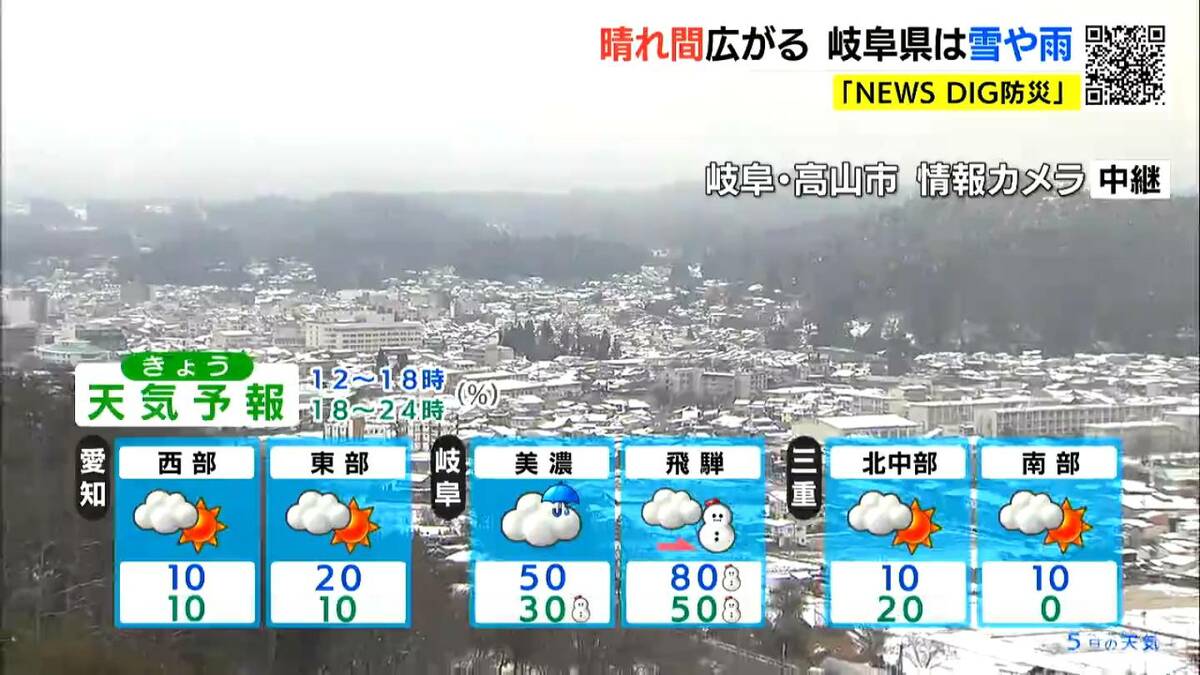 岐阜県で雪や雨か 山地を中心に積雪や路面凍結に注意を 最高気温は名古屋・豊橋・津で12℃予想 愛知・岐阜・三重の天気予報(1/5 昼)