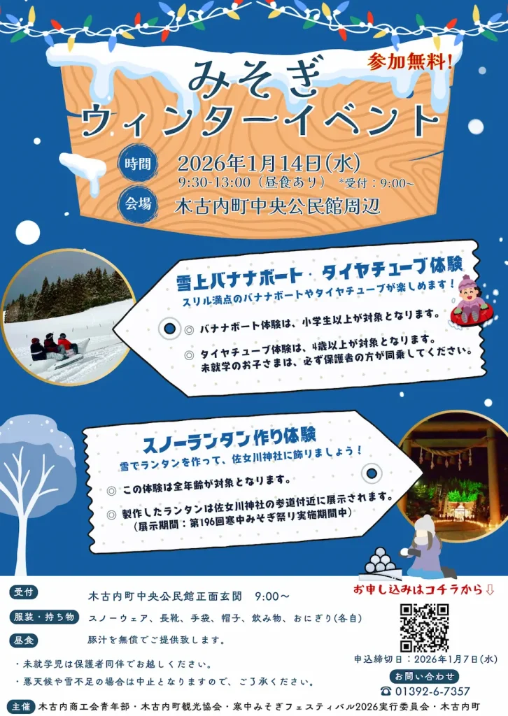 【イベント名】みそぎウィンターイベント【日程】2026年1月14日(水) 9:30~13:00(受付:9:00~)【会場】木古内町中央公民館周辺【参加申込】画像の二次元コードまたはこちらからお申し込みください ※申込締め切り1月7日(水)【問い合わせ】01392-6-7357 木古内町観光協会【URL】https://www.town.kikonai.hokkaido.jp/kanko/event/winter.html