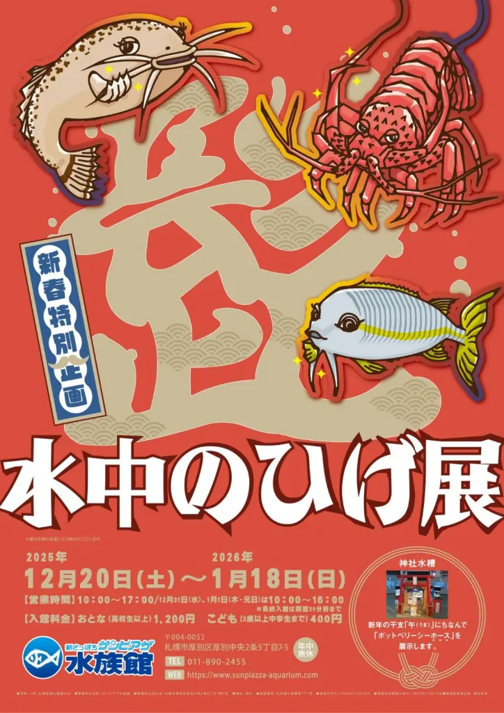 水中で暮らす生きものたちの「ひげ」に注目した、ユニークな新春特別企画「水中のひげ展」が開催されます。一口に「ひげ」と言っても、形や役割はさまざま。生きものたちそれぞれの特徴や不思議な生態を紹介します。また、毎年恒例の「神社水槽」も登場。2026年の干支である「午(馬)」にちなんだ生きものが皆さまをお迎えし、お正月気分を盛り上げます。生きものたちの意外な素顔をのぞきに冬休みはご家族やお友達とサンピアザ水族館へ!