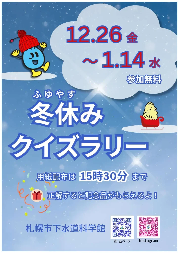 【イベント名】冬休みクイズラリー【日程】2025年12月26日(金)~2026年1月14日(水) 開館時間9:30~17:00(最終入館16:30)【会場】札幌市下水道科学館【問い合わせ】 011-717-0046 札幌市下水道科学館【URL】https://sapporo-src.com/kagakukan/event/index.html