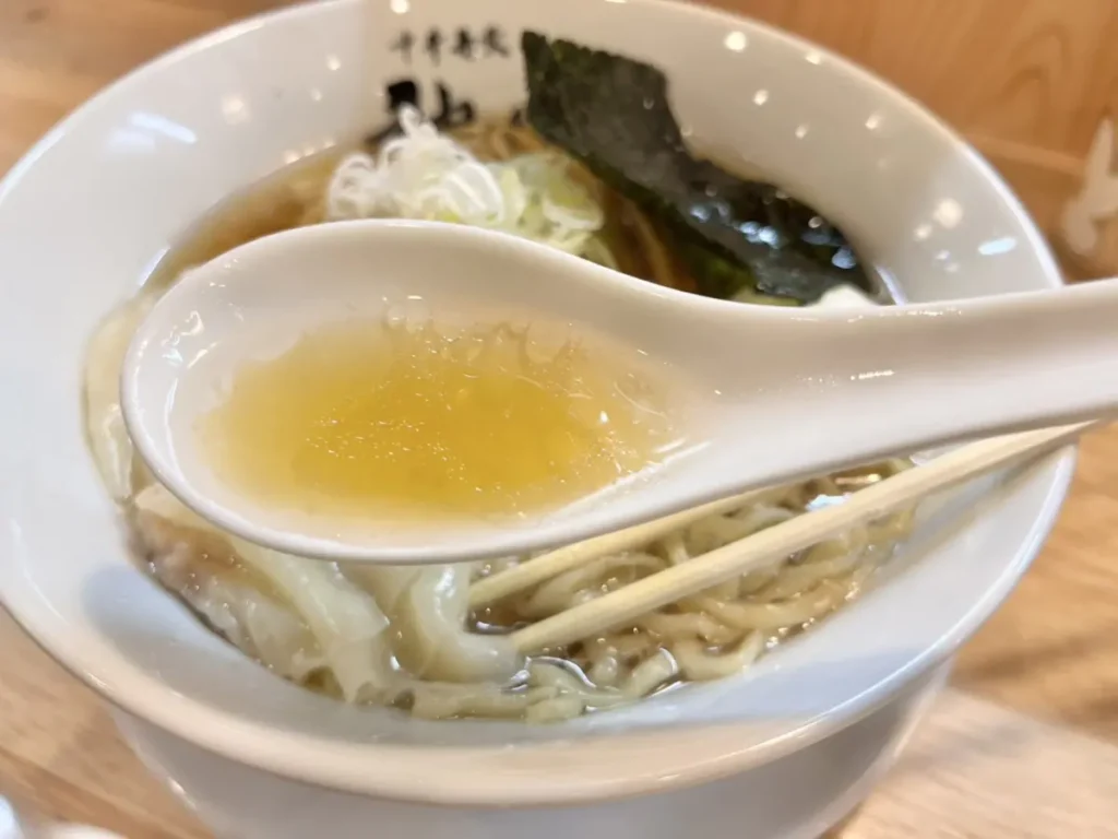 レンゲの底が見えるほどに澄んだ琥珀色のスープは、煮干しや焼きあごなど、選び抜かれた魚介の旨味が凝縮された一杯。まずはひと口スープを飲んでみます。口いっぱいに広がるのは、角のないやさしい醤油の香りと、じんわりと染み渡る出汁の奥行きある味わい。