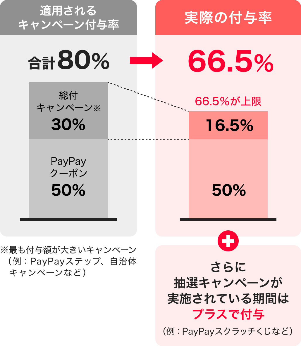 本キャンペーンが適用される場合に、PayPay株式会社が同時開催する他の総付キャンペーンの適用条件を満たすときにはそれらも適用されますが、1回のお支払いについてのPayPayポイントの付与率は、合計で支払額の66.5%が上限です(仮にそれぞれ適用すると合計66.5%を超える場合は、本キャンペーンによる付与分が縮減されます)。