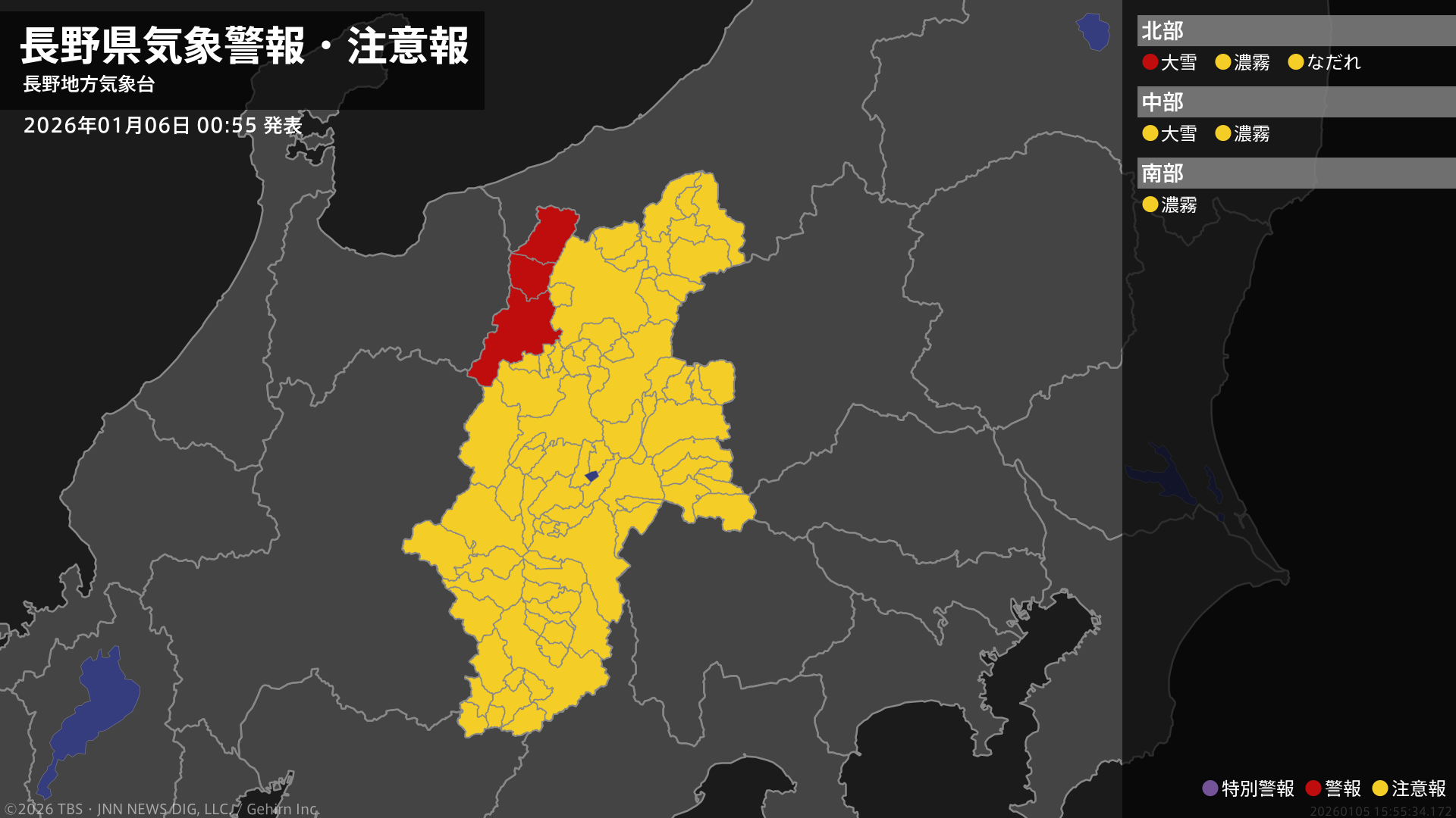気象台は、午前0時55分に、大雪警報を大町市、白馬村、小谷村に発表しました。