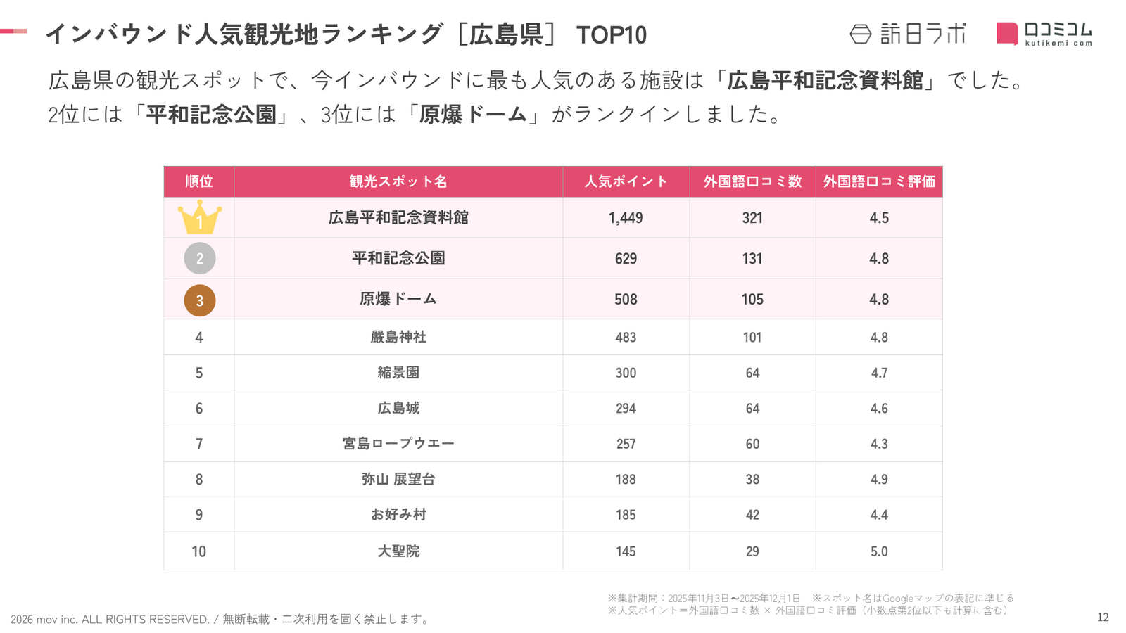 インバウンド人気観光地ランキング[広島県編]では、以下の内容が明らかになりました。