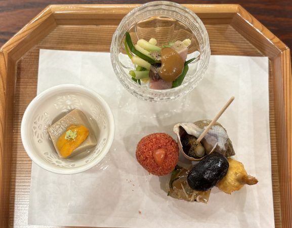 上から時計周りに、山浅葱と鰤、磯ツブ貝・クワイ・フグの皮の煮こごり・コーヒーで煮た花豆・ビーツの粉末ライスコロッケ、胡麻豆腐と生ウニ
