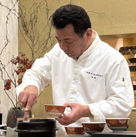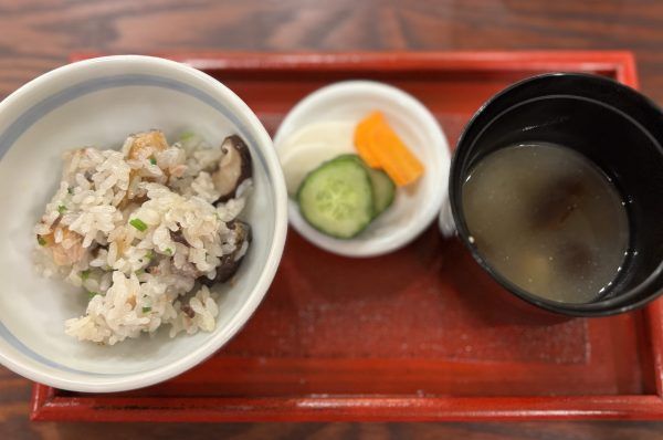 鰤とむかごの炊き込みご飯。ナメコのお味噌汁は、普段私が食べているナメコよりも大きくて立派で食べ応えがありました。そして! この炊き込みご飯は、料理人の秋田さんがよそってくれます。