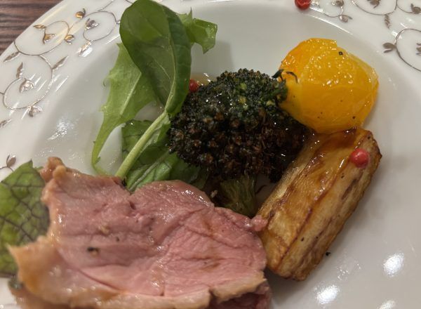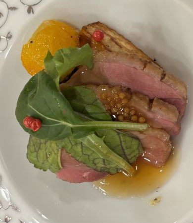 鴨は、麹に漬け一晩寝かせて低温55℃で調理。鍋などにすると硬くなりやすい鴨ですが、こちらの一皿はとても柔らかくて粒マスタードのソースとマッチしていました。