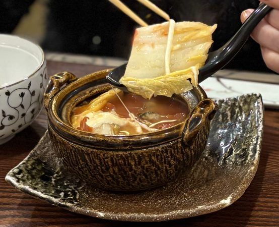 取皿があるのに食べたい気持ちがはやり、蓮華から直接アツアツと言いながら食べていました(笑)。白菜漬けの酸味とチーズのハーモニーが抜群です。