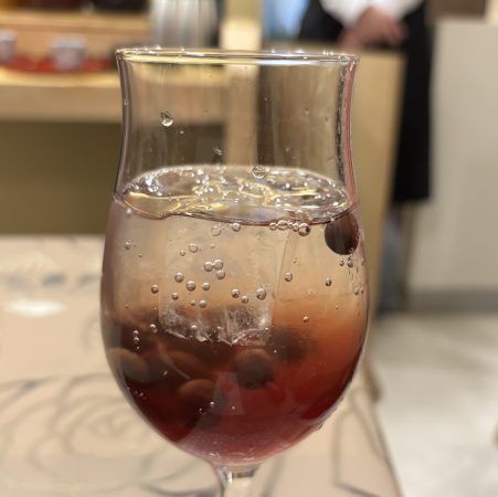 いよいよランチコースのスタート! まず食前に、麹に漬けた山葡萄を炭酸でわった甘いジュースをいただきました。麹だけでこんなに甘くなるんだ! 発酵の力すごい!