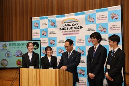 12月23日、埼玉県庁で行われた埼玉県知事の定例記者会見において、本学の学生広報サポーター4名が当日の司会進行等の会見運営や、パネル表紙の制作に協力しました。学生たちにとって、実際の行政広報の現場を体験する、貴重な機会となりました。