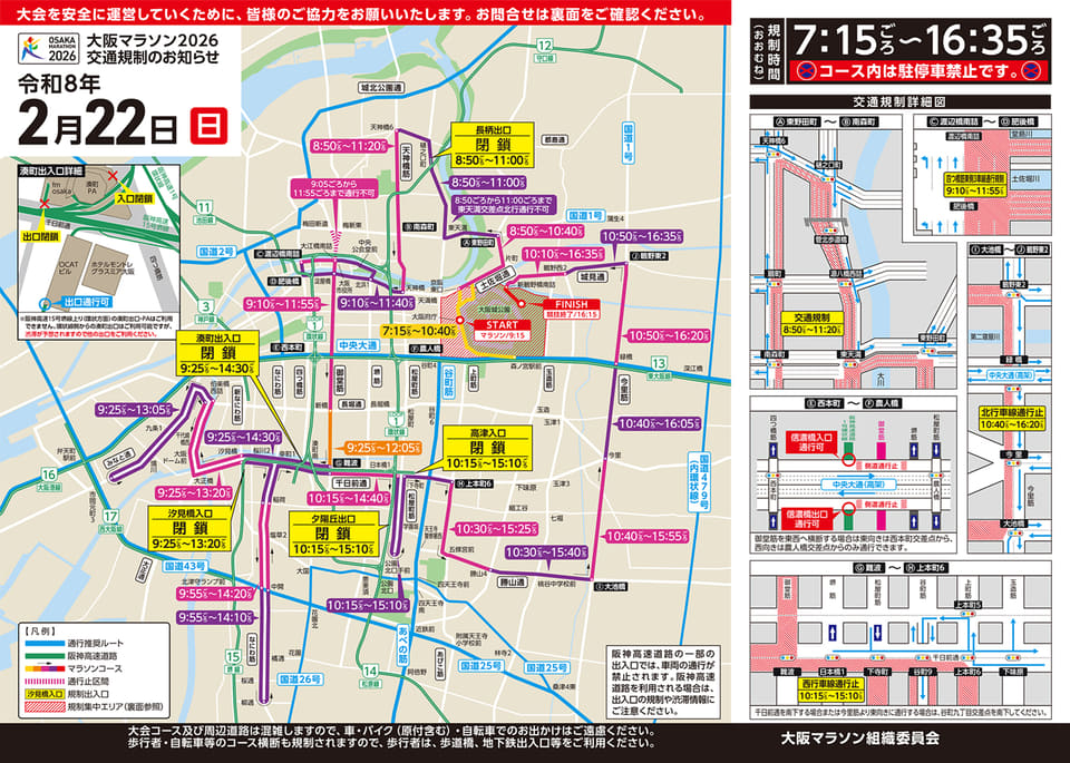7時15分ごろから16時35分ごろにかけ、競技進行にともなって車線規制や高速道路の出入口通行止めを実施。天神橋筋・御堂筋・千日前通・今里筋など市内の広範囲が対象となる。
