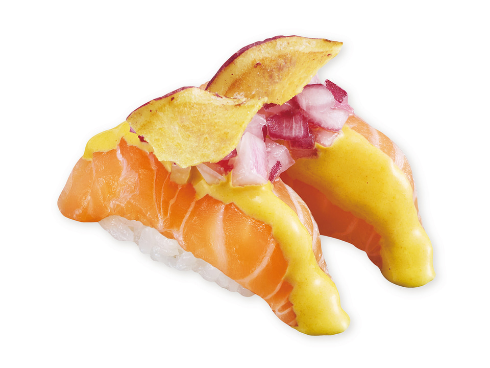 アヒ・アマリージョは黄色唐辛子の意味で、ペルーでは欠かせない香辛料。マヨネーズと合わせることで、まろやかなコクに唐辛子のピリッとした辛さがアクセントになっている。酢漬けした玉ねぎのさっぱりさと脂の乗ったサーモンとの相性も抜群とのこと。