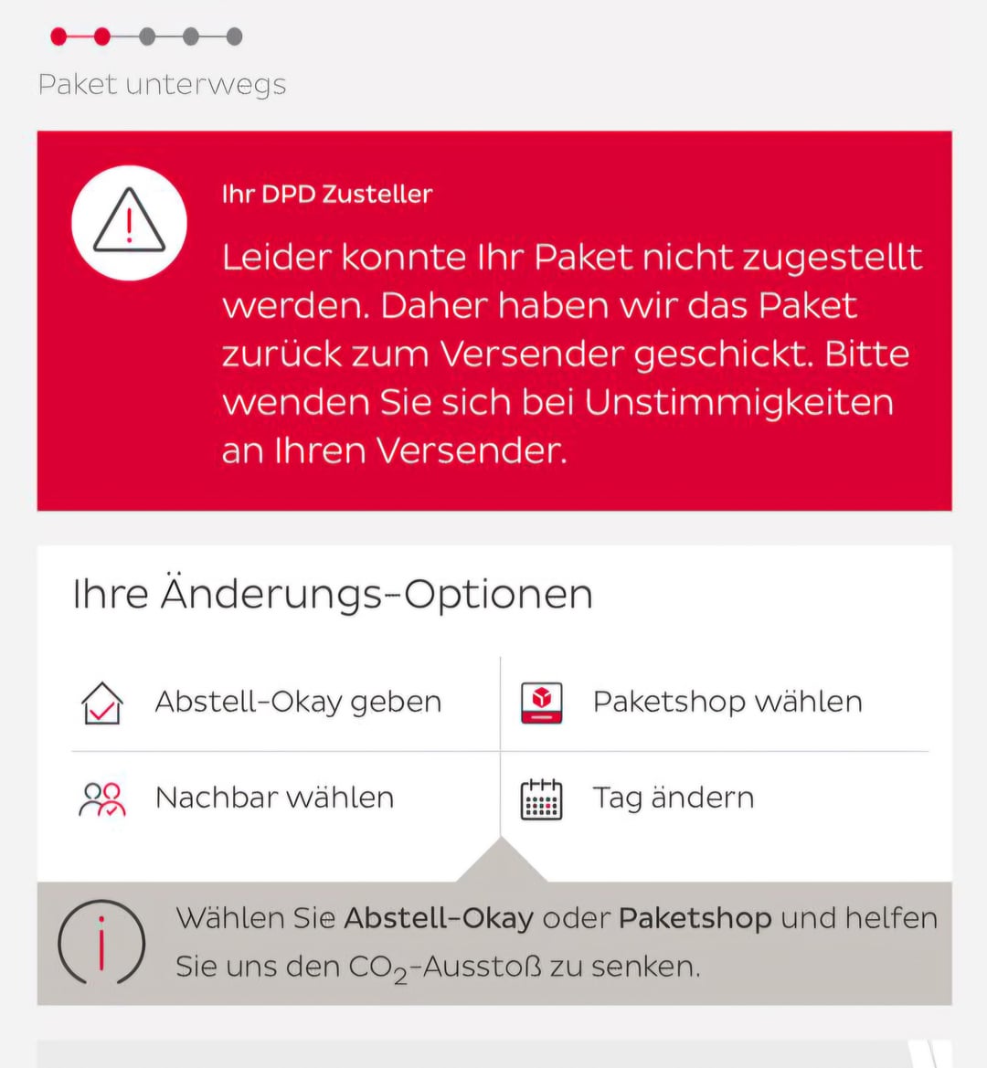 昨年ポップマートに注文し、ようやくドイツに到着したのですが、突然 DPD から配送できずポップマートに送り返すとの連絡を受けました。郵便受けにカードも何も入っていない。一日中家にいて待っていました。追跡番号を確認したので分かりました。 追跡番号を確認するために DPD ホットラインに電話したところ、機械音声で荷物はまだ配送途中であると告げられました。奇妙な。 Germany