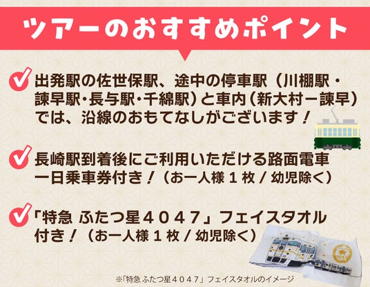 JR九州は、大村線沿線観光活性化協議会(以下、協議会)と連携し「特急 ふたつ星4047」を使用した佐世保駅~長崎駅間の往復特別運行によるオリジナルツアーを発売中です。ツアー当日は、協議会に所属する7つの市町(長崎市・佐世保市・諫早市・大村市・長与町・東彼杵町・川棚町)のおもてなしを停車駅や車内にてお楽しみいただけます。ぜひこの機会に「特急 ふたつ星4047」で佐世保~長崎の旅に出かけてみませんか? 皆さまのご参加をお待ちしております。