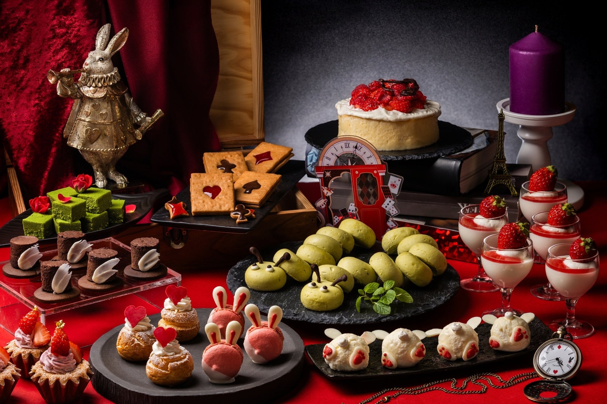 香ばしくサクサクのパイ生地で、なめらかなカスタードと苺を包み込んだ「苺のカスタード パートブリック包み」をはじめ、可愛らしいイモムシをモチーフにした「ピスタチオと苺のムース 青虫のケーキ」、苺のホイップクリームを添えたふわふわのシフォンケーキ、うさぎの耳をあしらった「うさぎのマカロン」、帽子仕立てに仕上げたガトーショコラなど、遊び心あふれるメニューが並びます。また、うさぎのおしりをあしらった「フロマージュブランと苺のうさぎのムース」や、苺のスープなど、物語の世界に迷い込んだかのようなラインアップをお楽しみいただけます。